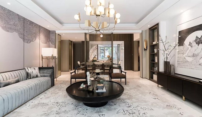 空間的整體布局簡(jiǎn)美方正,用東方“端正方整”的形制尋找最本質(zhì)的自由。而在簡(jiǎn)約空間中,更強(qiáng)調(diào)富有變化、多層次的空間場(chǎng)景塑造,將新貴階層的精神需求作為重點(diǎn)訴求。