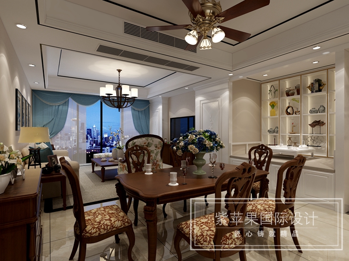 客餐廳:在甲方要求必須將現(xiàn)有家具使用的情況下,本案設(shè)計(jì)師巧妙運(yùn)用多層次吊頂把客餐廳空間區(qū)分明確,墻面大面積采用乳膠漆調(diào)色淡化過(guò)渡深色家具,輔以大面積白色底色,用青檸色流行色點(diǎn)綴加入流行的淡雅氣息,在電視背景巧妙的運(yùn)用了西式對(duì)稱造型隱藏了主臥房門(mén),充滿了復(fù)古雅致。